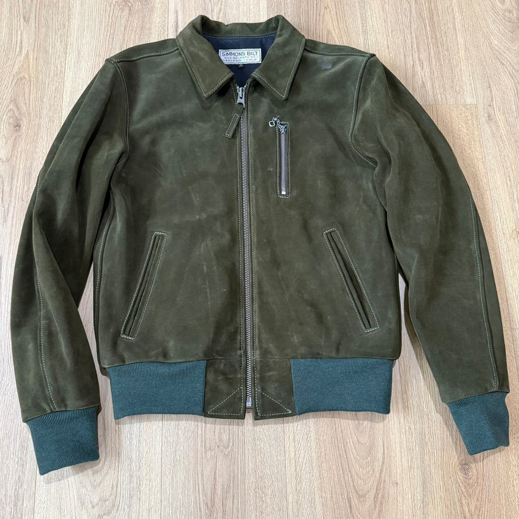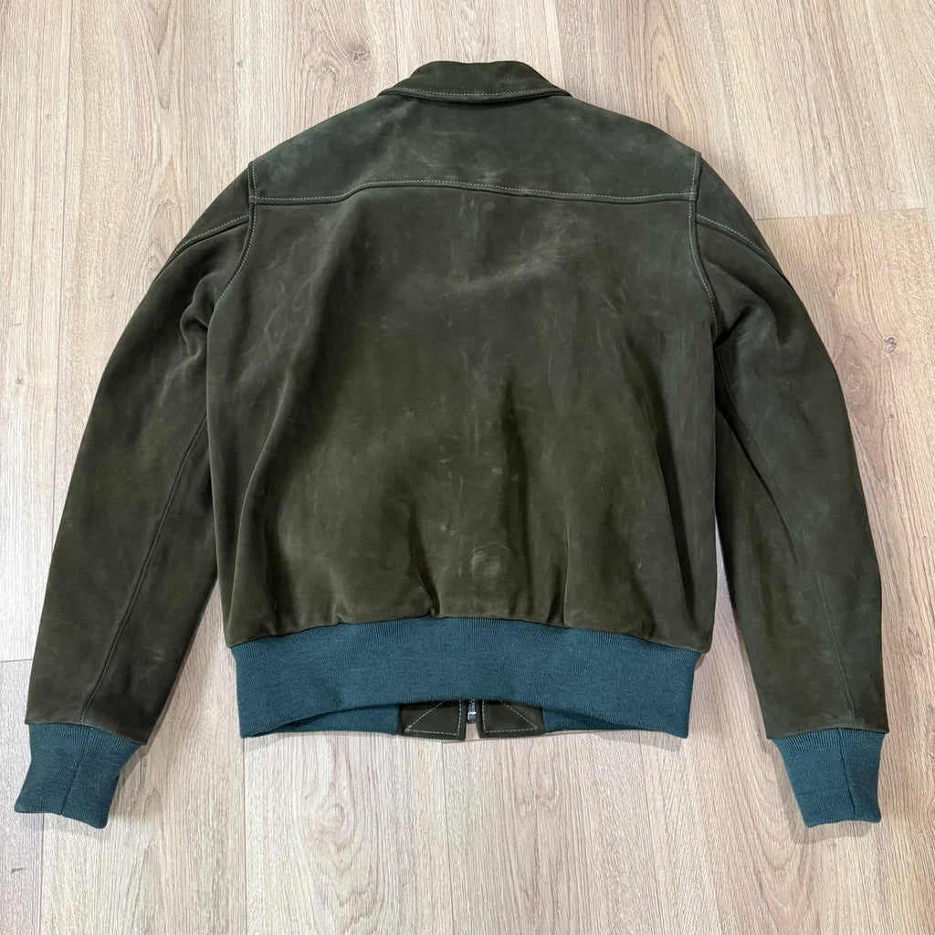 College Jacket made from olive suede, lined withblack cotton, one inside pocket, olive knitted waistband and cuffs, Gunmetal hardware and olive stitching. Outer measurements: Pit to pit 23.25" - Back length 26" - Shoulder 19.75" - Bottom Hem (laid flat) 20.5" - Sleeve 27"